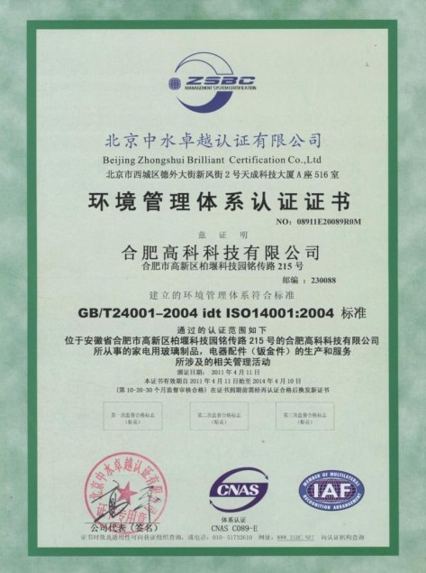環(huán)境管理體系認(rèn)證證書