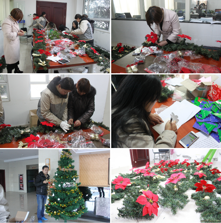 活動(dòng)現(xiàn)場(chǎng)設(shè)在行政大廳,經(jīng)過大家的努力,把大廳布置的非常漂亮,但前期的工作還是相當(dāng)大的,寫賀卡、組裝圣誕樹等,還搭配許多裝飾。